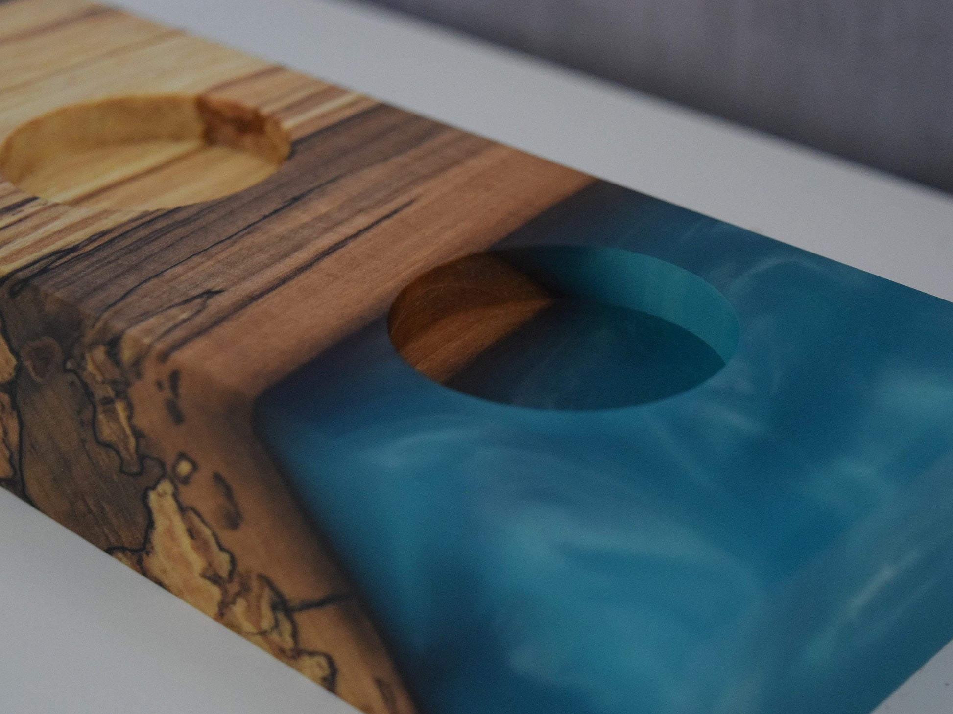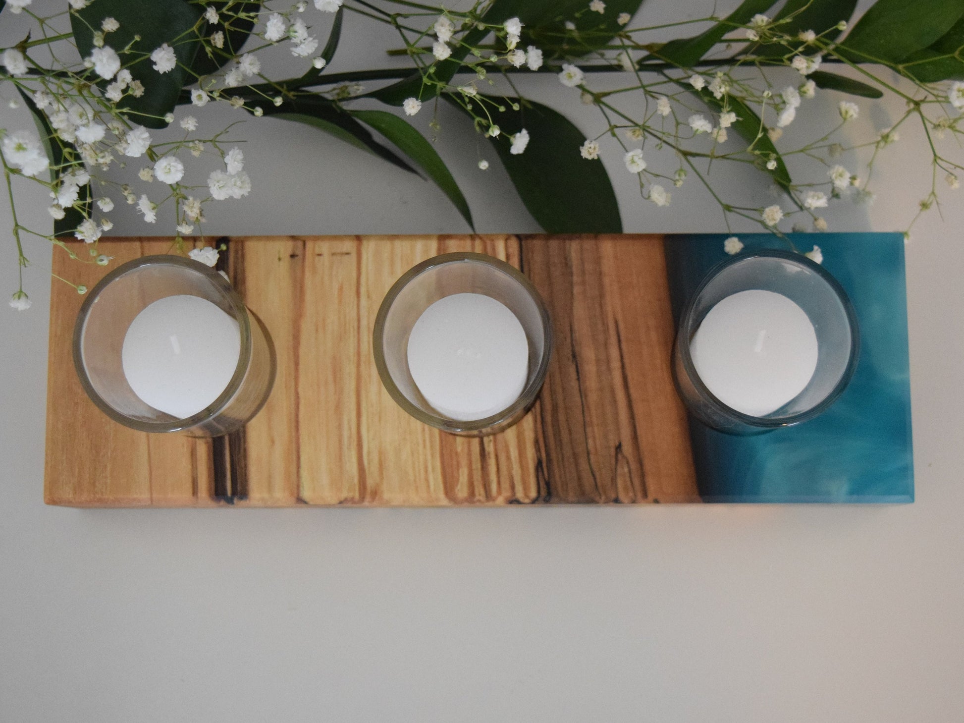 This wooden epoxy centerpiece would be a beautiful addition to your home or for any event. You can place it on your dinning table, on top of the mantel, etc. The candle holder will add an elegant and unique touch with the wood pattern of the spalted live edge wood and the epoxy. Although similar, no two candle holders will be the same.
